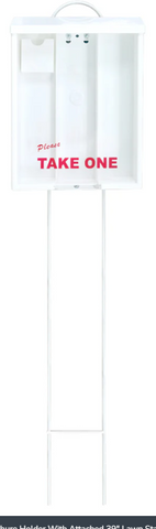 Plastic outdoor brochure box with white flip top lid and clear front.
